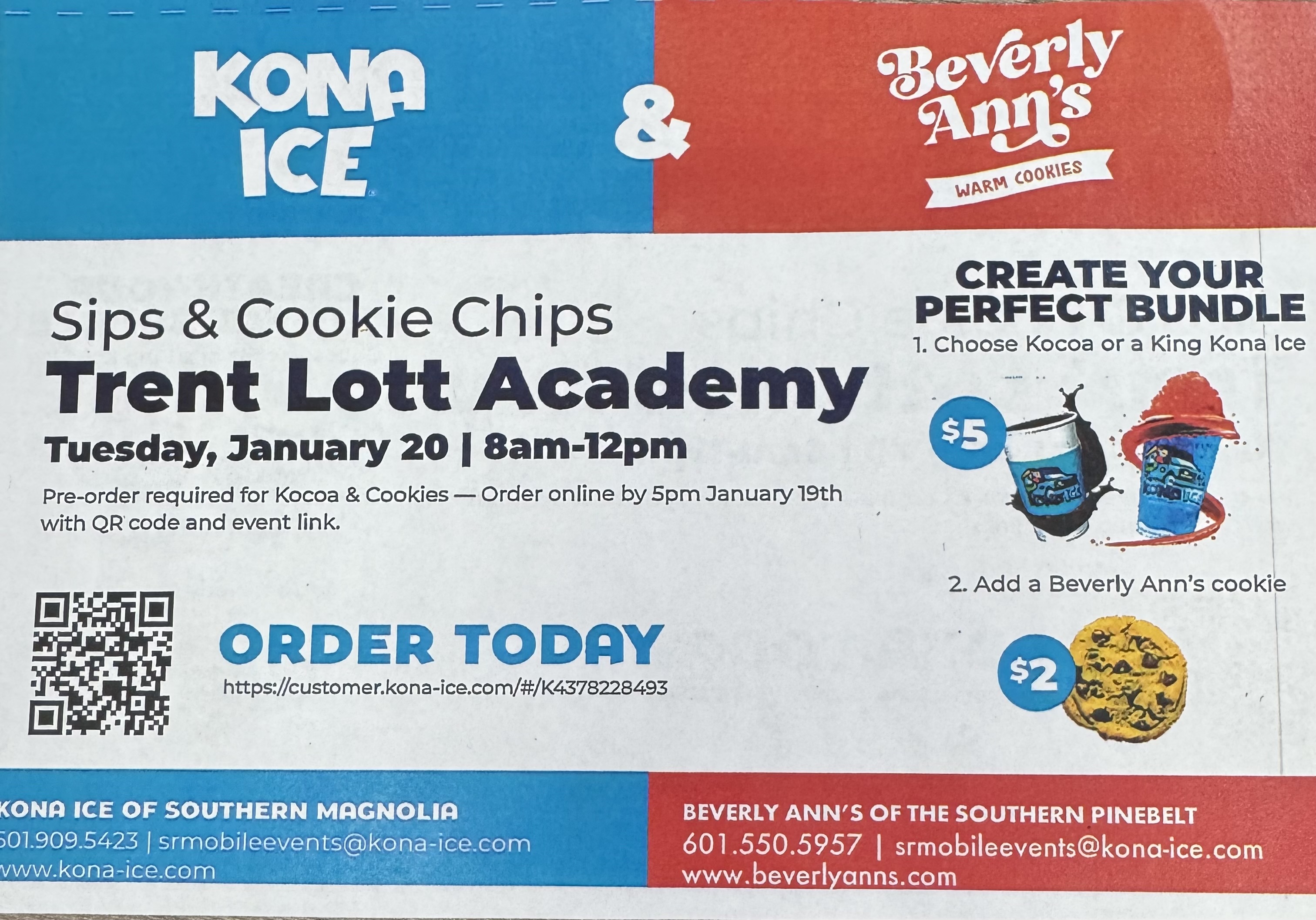 We will be having a KONA Ice/Cocoa Cookie Day to celebrate the 100th day of school, January 20. Orders for the cookies and cocoa must be done online by 5pm, January 19. Kona Ice will be available f...